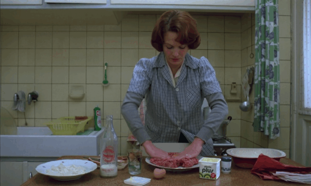 Ma anche la descrizione (spaziale e degli oggetti) è incisiva (taglia), per esempio quella estenuante dei manipulanda necessari per impastare il polpettone, forsenna e acutizza quella che per Genette era già una sua funzione nel realismo: il carattere esemplificativo e simbolico. Forse lo spettatore, ad un certo punto, si sente come “manipolato” e quindi disincagliato dal comfort sonnacchioso e morbido della poltrona e dei suoi cliché. Il carattere sfidante del film è affine all’enjeu del travail littéraire, cioè della letteratura come lavoro che secondo Barthes, “c’est de faire du lecteur, non plus consommateur, mais un producteur de texte”.