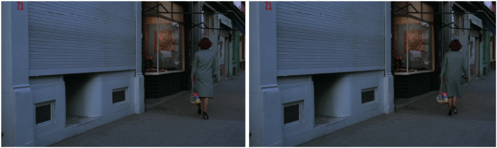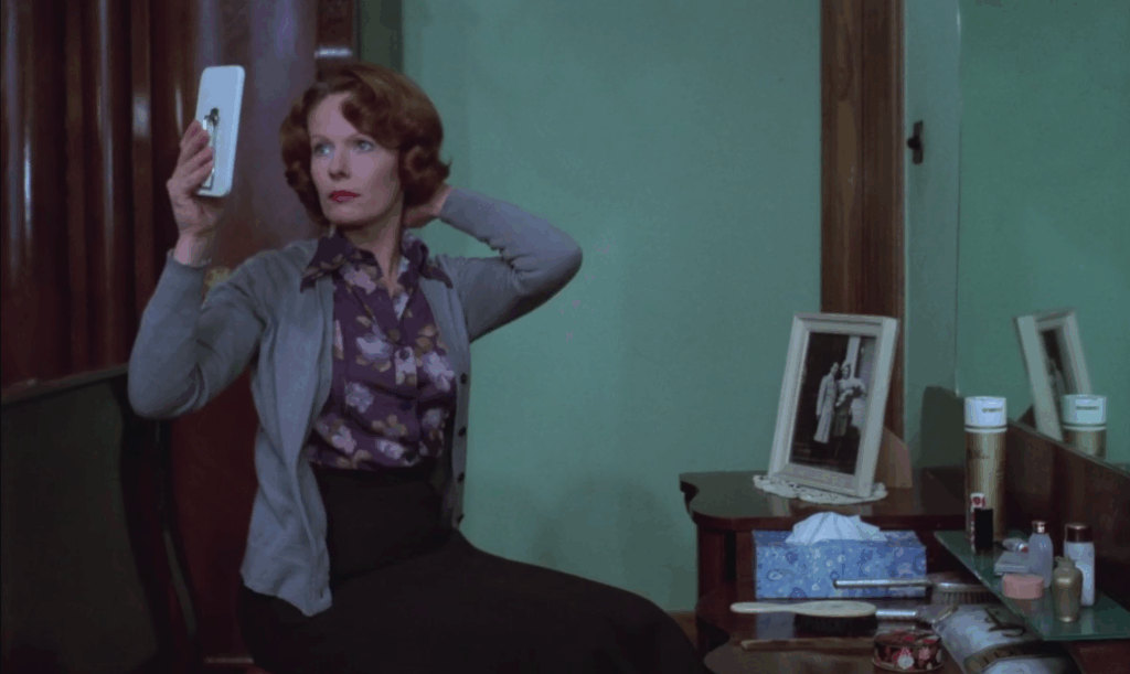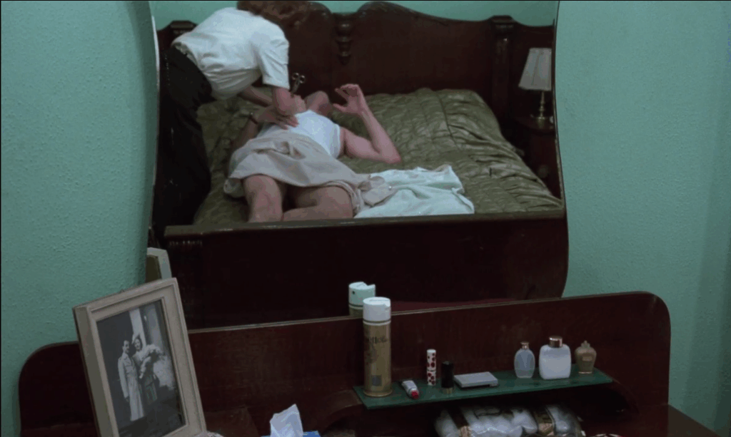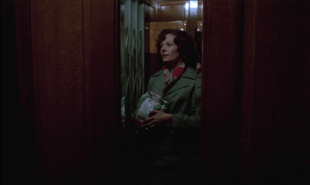 Lo specchio come coalescenza. Scrive Deleuze ne L’Image-Temps: “En termes bergsoniens, l’objet réel se réfléchit dans une image en miroir comme dans l’objet virtuel qui, de son côté et en même temps, enveloppe ou réfléchit le réel: il y a ‘coalescence’ entre les deux, Il y a formation d’une image biface, actuelle et virtuelle”. Jeanne Dielman si specchia, certo, lo fa anche attraverso il riflesso delle vetrine dei negozi in cui entra per effettuare le operazioni tipiche che scandiscono la giornata di una casalinga. Ma l’immagine riflessa tra barattoli e detersivi corrisponde al suo corpo? Soprattutto Jeanne Dielman prende l’ascensore in cui è collocato uno specchio e Akerman sceglie di inquadrare Jeanne Dielman attraverso o come in uno specchio, cioè l’inquadratura “spara” sullo specchio che ci restituisce l’immagine di Jeanne Dielman, non solo e non tanto come sdoppiata o scissa, alienata, ma piuttosto come una coalescenza tra immagine e corpo o forse immagine e immagine o un corpo a corpo che è anche una tensione di superficie perché è vero che immagine e corpo coesistono ma altresì vero che non sono perfettamente sovrapponibili.